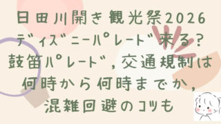 この記事では、2026年版の日田川開き観光祭で、ディズニーのパレードや、音楽パレードが来るのかどうか、パレードの時間とコース、交通規制の時間帯、そして混雑を避けるコツまでをまとめました。「ディズニーは来るか」「どんたくや鼓笛のパレードはいつ...