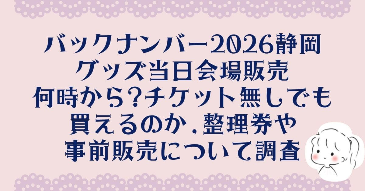 back number「Grateful Yesterdays Tour 2026」の静岡公演へ行く予定で、「グッズ当日会場販売はいつから?」「チケット持ってないと買えるの?」という疑問を、公式情報から整理しました。静岡エコパスタジアムでの時間帯や、pick upサービス(事前予約)の受付期間、当日のチケットの有無による扱いについて、まとめています。