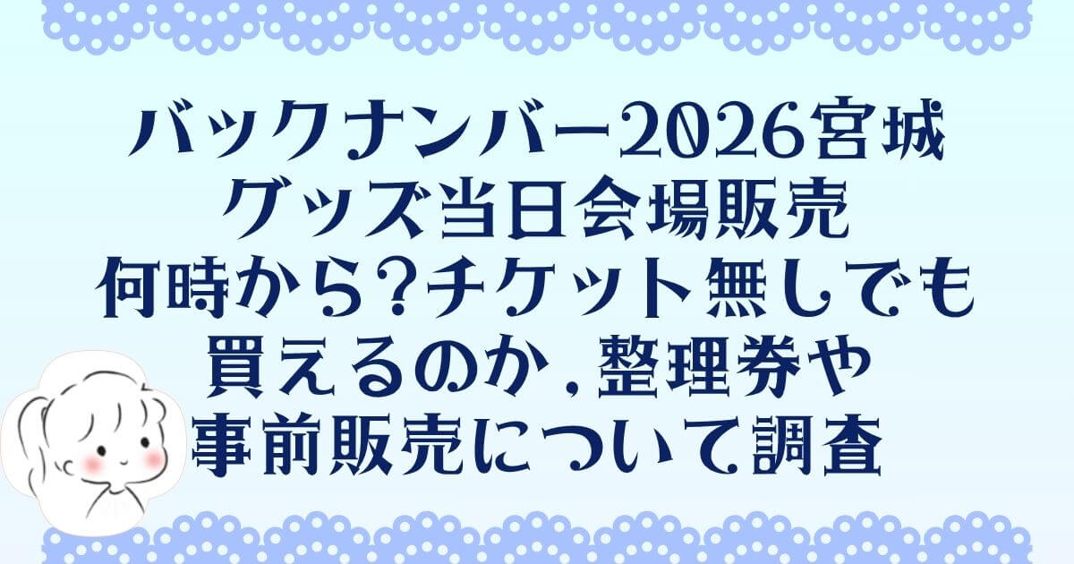 back number「Grateful Yesterdays Tour 2026」の宮城公演に行って、グッズを買うつもりだけど「当日会場販売はいつから?」「チケット持ってないと買えないの?」という疑問や不安を、公式情報からピックアップして整理しました。当日の混雑や時間帯を勘違いすると、せっかくのライブ前がストレスになるので、開場時間からグッズの並び方まで、まとめています。