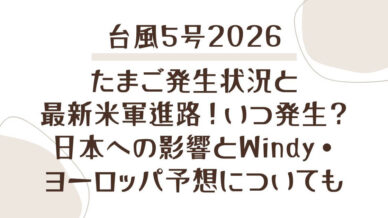 台風情報 台風5号2026たまご発生状況と最新米軍進路!いつ発生?日本への影響とWindy・ヨーロッパ予想についても この記事では、米軍(JTWC)・ヨーロッパ予想・Windy・気象庁の最新情報をもとに、台風5号の発生状況や今後の見通しを解説します。現時点で台風5号のたまごは発生していません。4/19更新5:30台風... 2026.04.16 台風情報