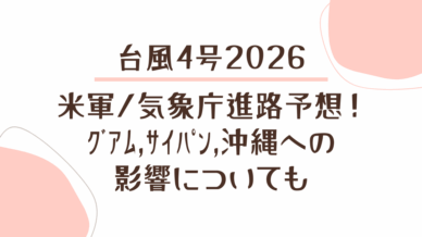 台風情報 台風4号2026米軍/気象庁進路予想!グアム,サイパン,沖縄への影響についても 2026年台風4号(シンラコウ)がマリアナ諸島へ猛進中です。気象庁は「非常に強い」勢力でグアム・サイパン直撃コースを予想し、米軍JTWCも最大瞬間風速70m/s超の見込みを示しています。沖縄や日本への... 2026.04.17 台風情報