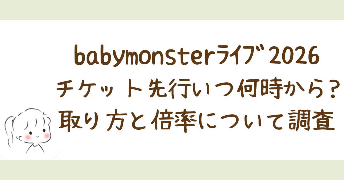 BABYMONSTERの2026年日本公演について、チケット先行がいつ何時から始まるのか、どう取るのがよいのか、倍率はどれくらいになりそうかを、公式情報を中心に調べました。現時点で日本公BABYMONSTERの2026-2027ワールドツアー日本公演チケット先行が、今日3月31日18:00からMONSTIEZ (JP)会員抽選でスタートするので、最新情報を基に取り方と倍率を徹底調査しました。人気急上昇中のYGガールズグループだけに、京セラドームを含む全国公演の争奪戦が予想され、先行を逃すと一般発売で厳しくなります。この記事では公式詳細をそのまま整理し、過去K-POP公演のデータから倍率を予想、応募ミスを防ぐチェックリストや席種別戦略をオリジナルでまとめました。他記事の単なるスケジュール羅列を超え、W会員登録の即行動ポイントやアップグレード成功率まで具体的に解説します。