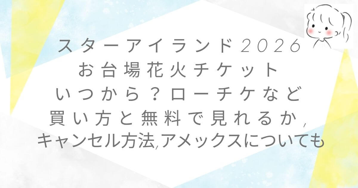 ローチケなど複数の購入方法があり、無料で見る方法やキャンセル手順、アメックス特典もご紹介します。スターアイランド2026お台場花火のチケットは、すでに複数のサイトで販売が始まっています。
